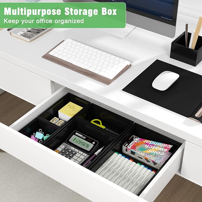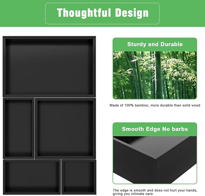 - 【Multiple Sizes & Stackable Design】 This Black Bamboo Drawer Organizer Set contains 5 sizes: 10.47” x 6.69” x 2.5”, 6.93” x 6.93” x 2.5”, 6.54” x 3.98” x 2.5”, 6.93” x 3.58” x 2.5”, 3.98” x 3.98” x 2.5”; Our small drawer dividers fit anywhere with different size items and can be arranged to fit your specific needs. Besides, these bathroom drawer organizers can be stacked to save more you space, especially when organizing desk, bathroom countertop or the higher drawers.