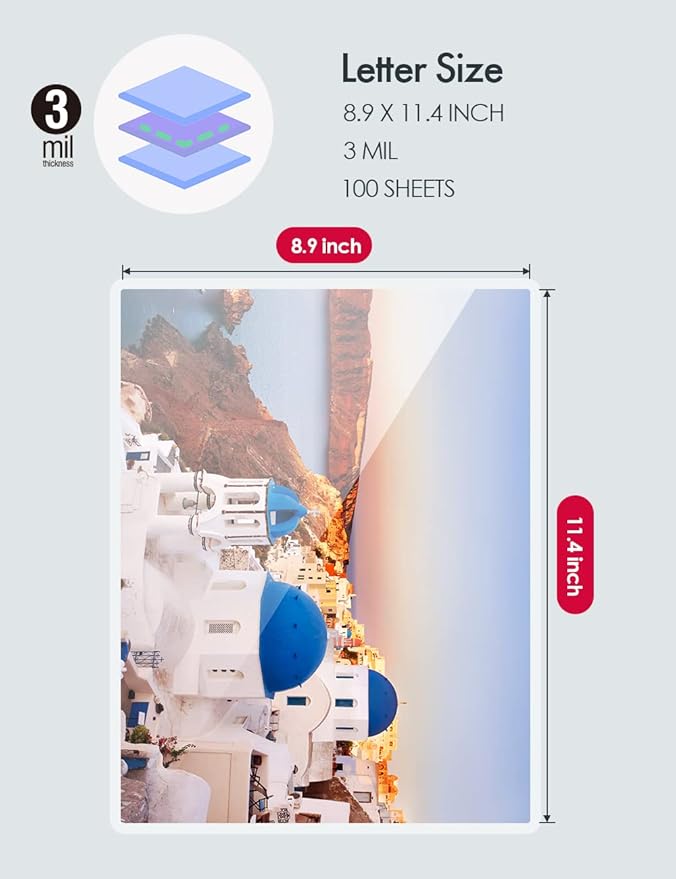 - 【Specifications】Fits Letter size documents, 8.5 x 11 in (229mm x 292mm), pack of 100 Laminator sheets, 3Mil thickness;