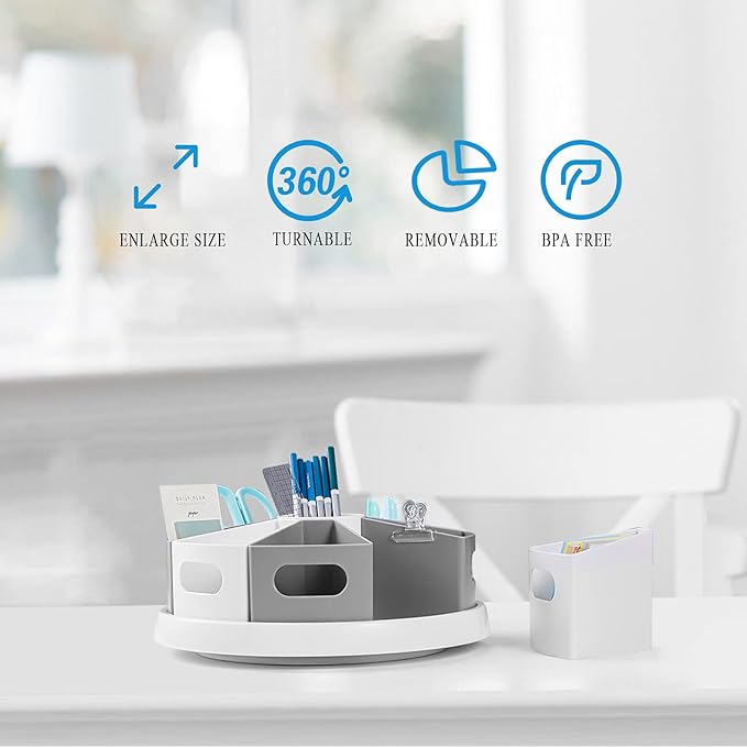 - MULTIPURPOSE LAZY SUSAN STYLE DESK ORGANIZER! Forget boring storage trays, our Rotating Office Supplies Storage Organizer is truly multipurpose with 9 deep bins, a super smooth 12” turntable & great colors – perfect for serving snacks, office and school supplies, organizing makeup & transforming messy desktops into mess free order!