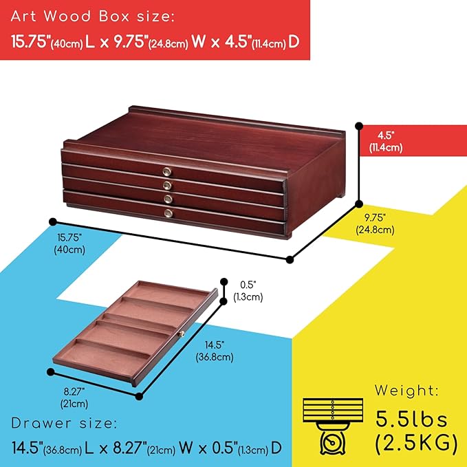 - Great Storage with Compact Box: 15.75" x 9.75" x 6.5"LWH, this wooden art box with drawers is easy to collect art supplies, simple and clear for artists and painters who want to store art tools like pastels, brushes, pens, pencils, blending tools, small accessories and more.
