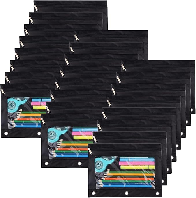 YoeeJob Pencil Pouch for 3 Ring Binder, Binder Pouches with Zipper Bulk, Pen Holder Case with Clear Window School Class Office Organizers, 24 Pack, Black