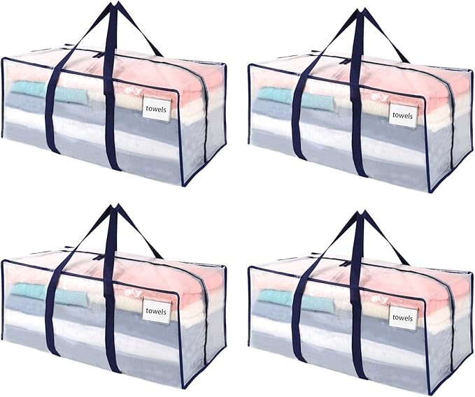 VENO 4 Pack Moving Bags Plastic Storage Totes Clothes Organization Large W Lid/Zipper. Packing Boxes/Bins Alternative. Space Saving Foldable College Supplies Essentials (Clear, 4 Pack)
