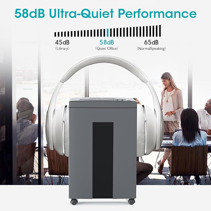 - 【Ultra-Quiet Performance】Low noise level 58dB ultra-quiet performance; 6 gallons pull-out waste bin with large easy viewing transparent window. Perfect for a home paper shredder or a quiet paper shredder for office environments.