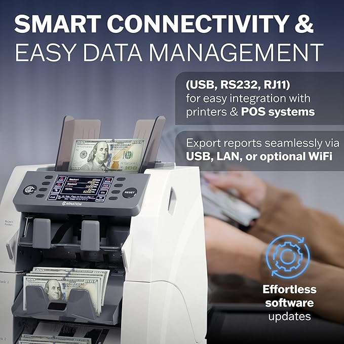 - Multi-Currency Support for Up to 128 Currencies: This money machine supports seamless counting of up to 128 currencies, including USD, CAD, BRL, and MXN, making it ideal for businesses handling various denominations.