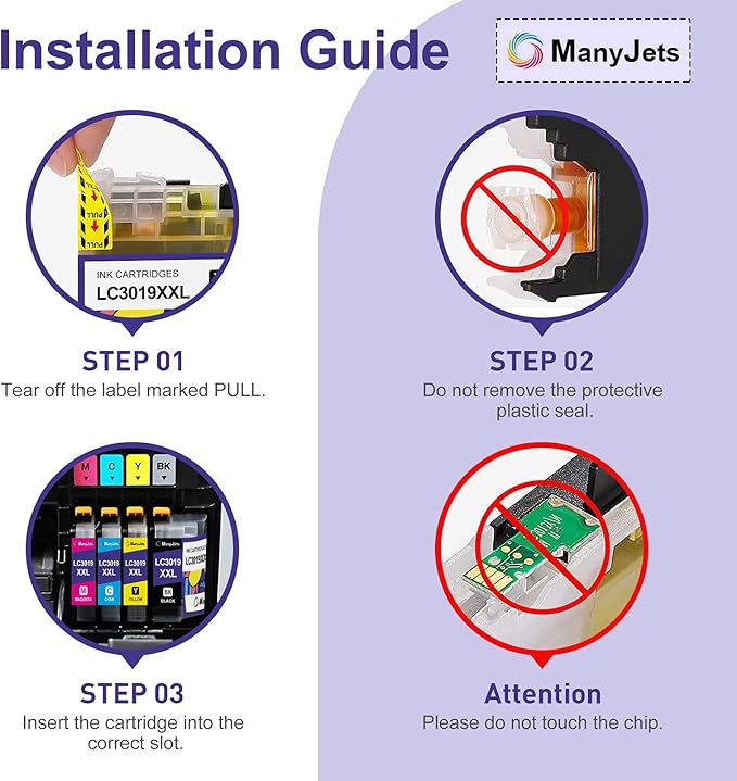 - PACKAGE CONTENTS: PACKAGE CONTENTS: ManyJets compatible for Brother LC3019XXL ink cartridges include 2 x LC3019XXL Cyan, 2 x LC3019XXL Yellow, 2 x LC3019XXL Magenta (total 6 pack)