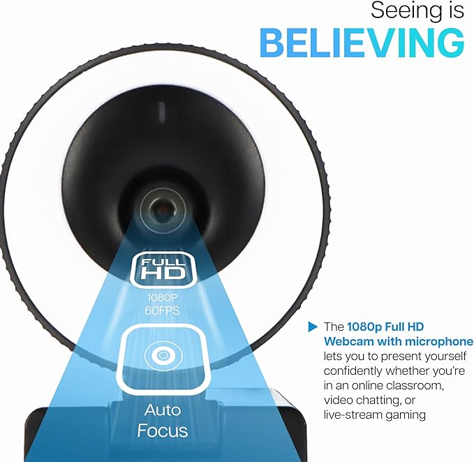 - SEEING IS BELIEVING: The 1080p Full HD Webcam with microphone lets you to present yourself confidently whether you’re in an online classroom, video chatting, or live-stream gaming