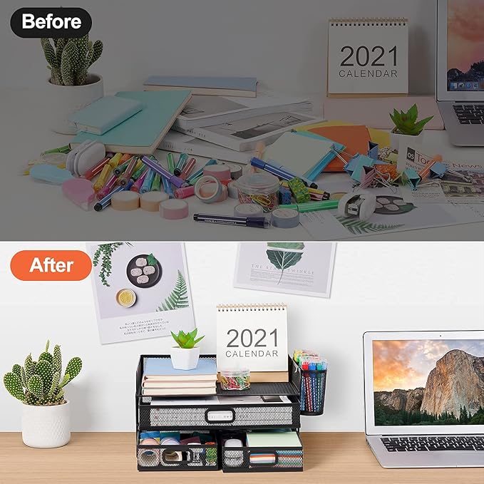 - 【Convenient Personal Storage】Compared with other mesh desktop organizer. The Multi-drawer design can help you store some important papers, whether it is personal letters or personal information can provide you with a certain privacy protection space.