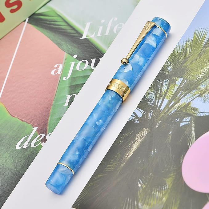 - The acrylic resin celluloid evokes a vintage aesthetic, particularly sky blue marble design that appears in this pen