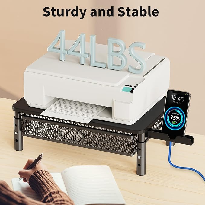 - Get Organized with the Metal Drawer&Foldable Phone Holder- Make full use of the space under the stand riser platform to keep your workstation clean and organized. The sliding drawer is perfect for US letter-size paper,and the foldable phone holder on both sides can help you work more efficiently.