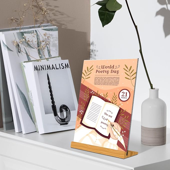 - Design: Acrylic sign holder L-shape 8.5x11 inch slant back design using high quality acrylic and beech wood base.