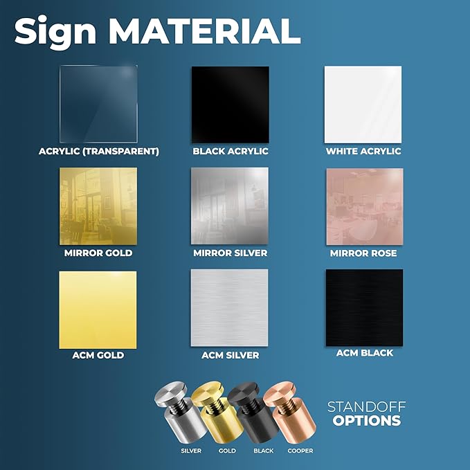 - Material : 1/4" Thick Clear Acrylic, Clear Acrylic, White Acrylic, or Black Acrylic, ACM Gold, or ACM Silver, or ACM Black, Acrylic Mirror Silver, Acrylic Mirror Black, or Acrylic Mirror Rose Gold 1/4" Thick Clear Acrylic, Clear Acrylic, White Acrylic, or Black Acrylic, ACM Gold, or ACM Silver, or ACM Black, Acrylic Mirror Silver, Acrylic Mirror Black, or Acrylic Mirror Rose Gold