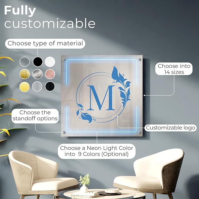 Personalized Floating Custom Acrylic Business Logo Sign | Free Company Vector Logo | Address Signage | Sign for Office Storefont | Multiple Size Options | Neon Led Lights Optional