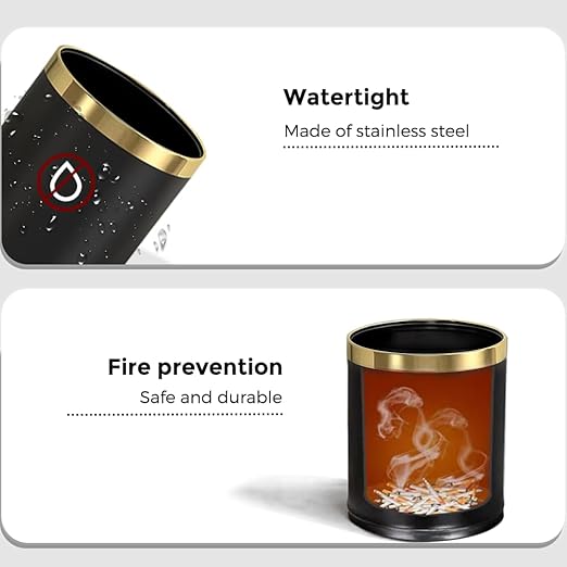 - 【Appearance and material】: This is a textured metal trash can, which is composed of two layers of metal, thick and easy to use.It is a combination of black and gold, stylish and textured, more like an ornament