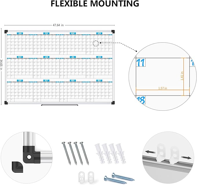 XBoard Magnetic Calendar Whiteboard 48" x 36", 12 Months Calendar Dry Erase Board, Silver Aluminium Framed White Board Planner for Home School Office Organization