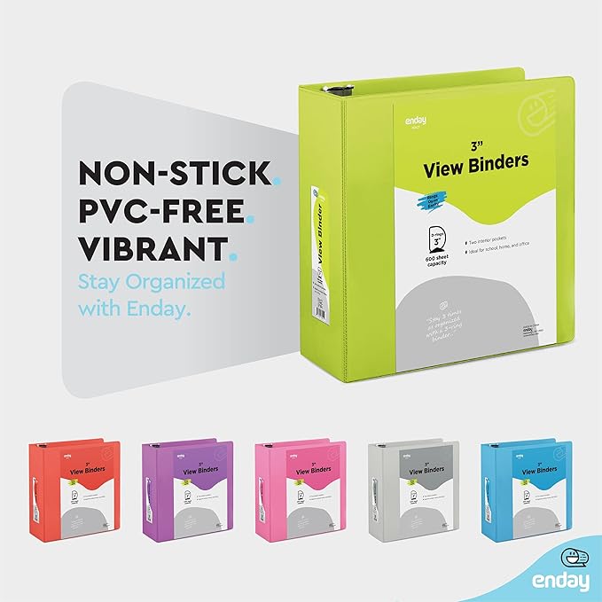 3 Inch Binder 3 Ring Binders Green, Slant D-Ring 3” Clear View Cover with 2 Inside Pockets, Heavy Duty Colored School Supplies Office and Home Binders – by Enday
