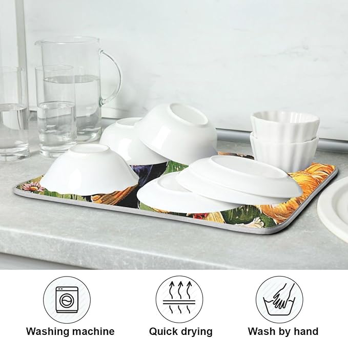 - Material: The printed surface of the kitchen tableware drying mat is made of high-quality polyester.The middle layer of the kitchen drying pad is composite sponge, which can quickly absorb moisture and keep the kitchen table dry and tidy.