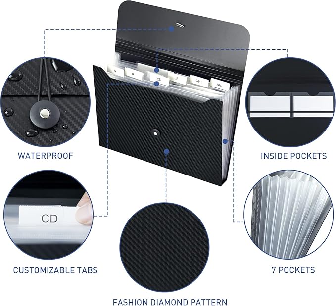 - EASY TO CLASSIFY AND FIND: Our expanding file folder are designed with 7 expandable pockets, great for classifying all your different files neatly. Tab inserts are provided to label each pocket, so you can find the paper you need quickly and easily. keep everything in order, say goodbye to the mess