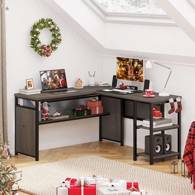 - [Reversible L-Shaped Desk]: The shelves of the desk can be assembled on either the right or left side, depending on your preference. With its 59-inch wide desk top, it offers plenty of space to accommodate three monitors and laptops. If you're a gaming enthusiast, this L-shaped computer desk is also an excellent choice. It comes with two adjustable shelves, perfect for storing bulky books or stacks of important paper. By keeping clutter out of sight, it helps maintain a clean and organized desk