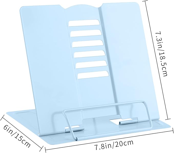 - 6 Adjustable Reading Positions Book Stand: Length-7.3in, Width-7.8in. The cookbook stand holder is adjustable with various notches at the movable rear back stand, which makes you can adjust the height and angle according to your need. Promotes proper posture for better spinal health.