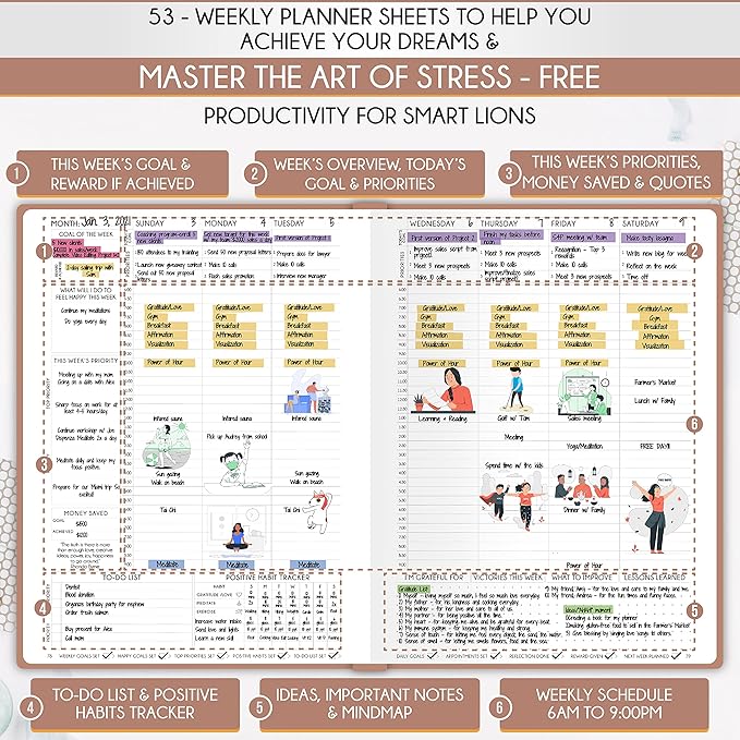 - LIFE PLANNER - A5 Size, 212 pages of life transformation, 53 weekly, 12 monthly planning overviews & reflection, 22 dotted journal pages, habit trackers, mind maps, morning & evening routines, inner pockets, pen holder & gift box