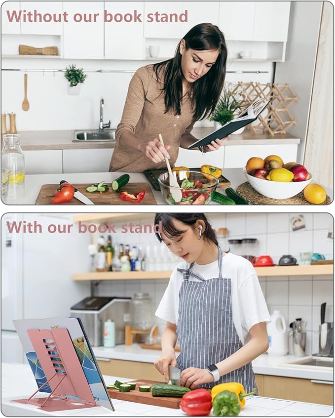 - 6 adjustment points: Length-7.3in, Width-7.8in. The cooking bookshelf can be adjusted to an appropriate angle through the 6 notches on the movable back support as needed, which promotes the correct posture and reduces the fatigue of long-term reading.