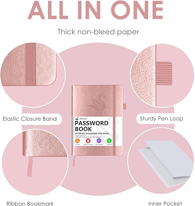 - PREMIUM QUALITY & PERFECT MEDIUM SIZE: This password journal comes with a high-quality leatherette hardcover, an elastic band, pen holder, ribbon bookmarker, and inner accordion pocket. It measures 5.2 inches wide and 7.6 inches long, which is the perfect size for your needs.