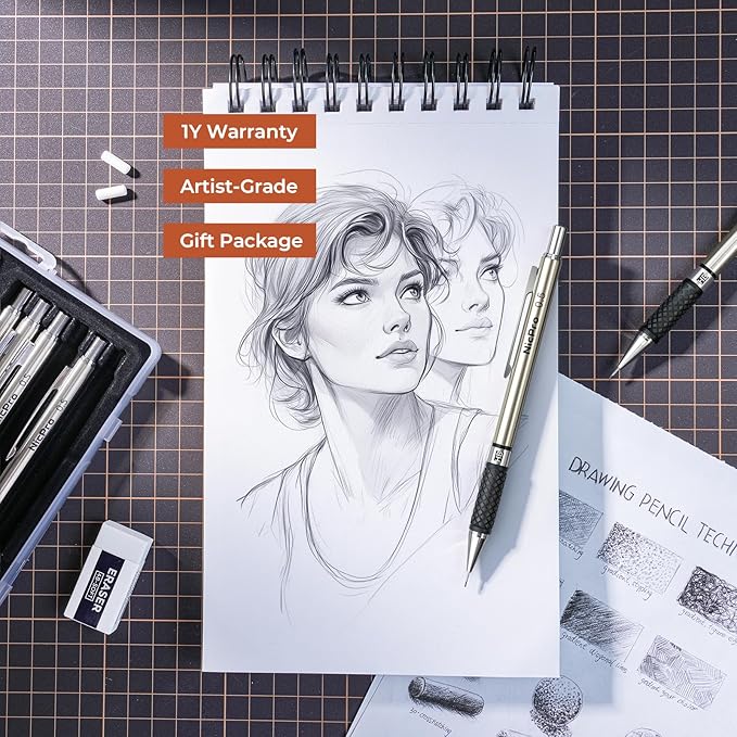 Nicpro 0.5 mm Art Mechanical Pencils Set in Gift Case, 6 PCS Metal Drafting Pencil 0.5mm with 6 Tube HB Lead Refills & 18 PCS Eraser Refills for Adults, Children, Artist Writing, Drawing, Sketching