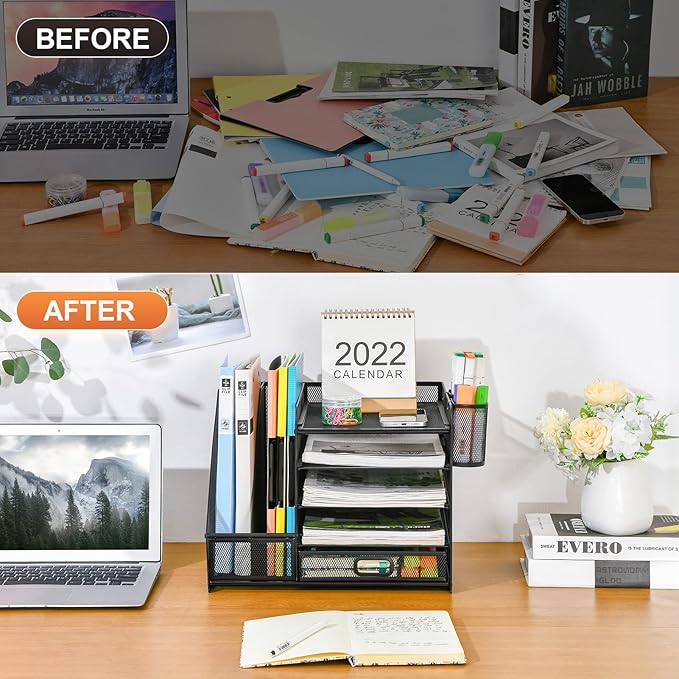 - 【Ideal Desk Organizer】Marbrasse newly releases the desk file organizer! The humanized office organization owns 5 sliding trays + 2 Magazine Holders + 2 Hanging Pencil Holders + 1 sliding drawer which tidies up your desktop and is convenient to your office! All the designs specialized to comply with your office, such a perfect supplies desk organizer must be the best choice for your office accessories