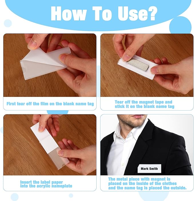 - Reliable and reusable: the name badge is made of quality acrylic, which is sturdy and safe, it can clearly display your name, and the magnetic label holder is made of 2 neodymium magnets and stainless steel plate, not easy to fall off, the reliable material ensures that these magnet backings name tags accompany your for a long time