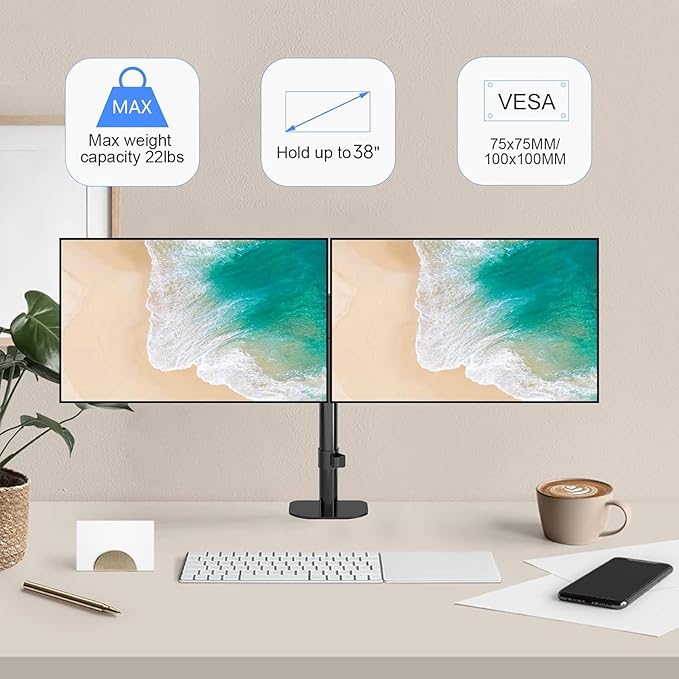 - GREAT MONITOR ARM: This dual monitor mount fits screens that weigh up to 22 lbs with backside mounting (VESA 75x75mm or 100x100mm). This monitor arms for 2 monitors covers most monitors on the market between 13 inch and 38 inch. Compatible with ASUS, Acer, Samsung, LG, HP, AOC, Dell, Lenovo, etc., including but not limited to38 32 27 25 24 23 22 21 20 19 17 13 inch screen.
