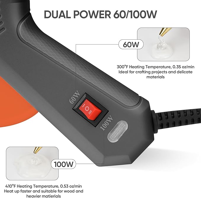 - ✅[DUAL POWER OUTPUTS] RoMech hot glue guns offer dual temperature setting, feed glue at your pace. The simple power switch allows quick temperature adaptation for all your projects. 60W is suitable for crafting projects and delicate materials, maintains 300°F heating temperature and 0.35 oz/min flow rate. 100W is ideal for wood and heavier material, heats up fast at 410°F and higher 0.53 oz/min flow rate.