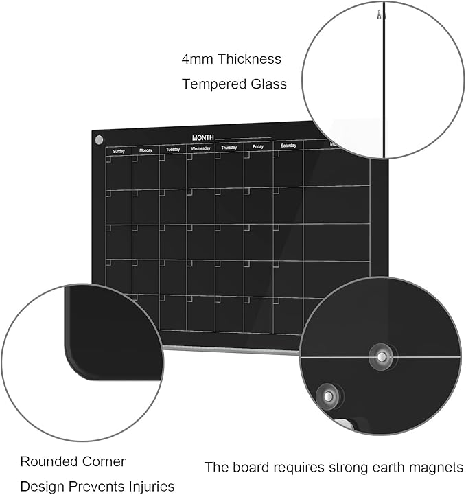 - Black Surface More Modern & Upscale: Frameless tempered board design blends seamlessly into any environment. Elevate your office/home, even classroom with this premium clear glass dry erase calendar