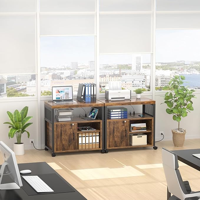 Unikito Lateral File Cabinet, Locking Office Filing Cabinets with Socket and USB Charging Port, Modern Rolling Printer Stand with Storage for A4, Letter Size and File Folders, Rustic Brown