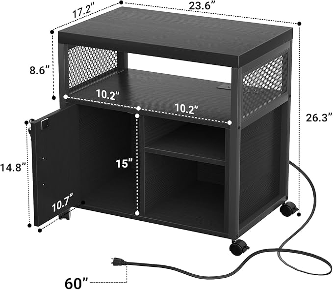 - 👍【Multifunctional】 This rolling printer stand featured with a lockable door, which allow convenient file access and add security that keep your business private. The two open shelves is great to store and display for binders, folders, books, furnishing articles or decor. You can also adjust the shelves height as your different needs.