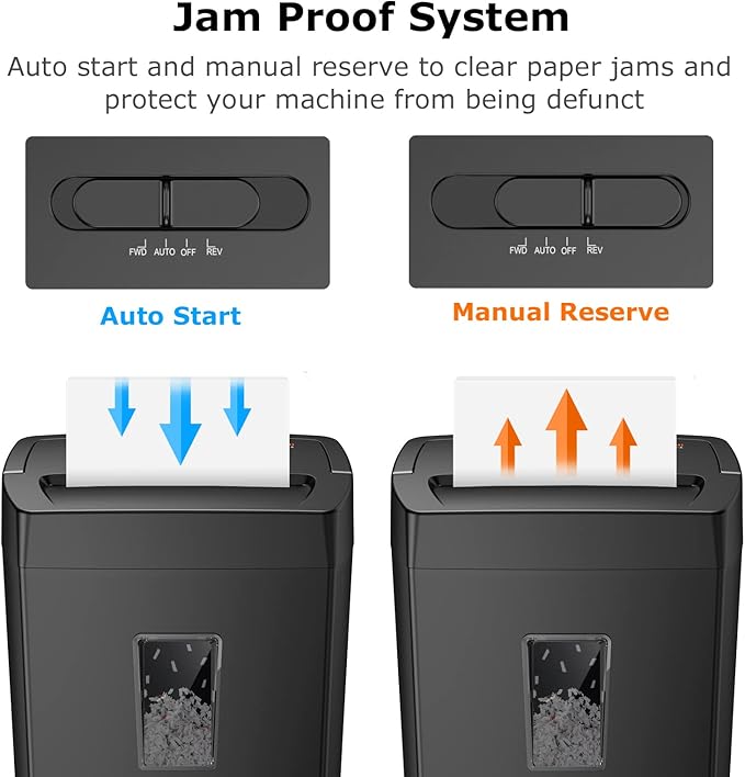 - 【Easy Operation & Safe Protection】Auto start/stop and manual-forward/reverse function protect the paper shredder heavy duty from the frustration of paper jams. Overheat protection helps you use paper shredder without worrying and prolong its lifetime. The document shredder will stop working once lift the head, keeping you safe.Important Note: We test every shredder before shipping, which means you may see some paper shreds from the testing.