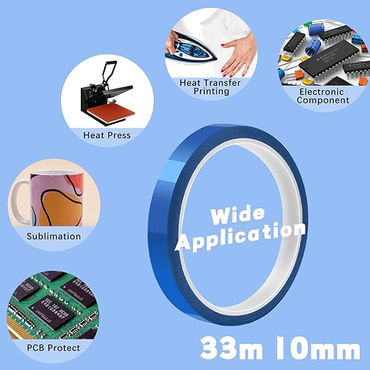 - 【Wide Range of Applications】HTVRONT heat press tape is not only suitable for sublimation on coffee cups, but also ideal for 3D printer, and heat transfer vinyl on T-shirts, pillows, clothing, fabrics. Also extensive use as electrical insulation for transformer, motor, coil, capacitor and frequency conversion power supply in electronic industry. Great craft heat tape for all kinds of art projects.