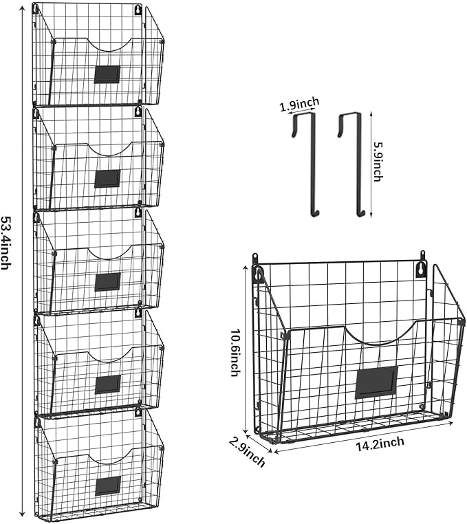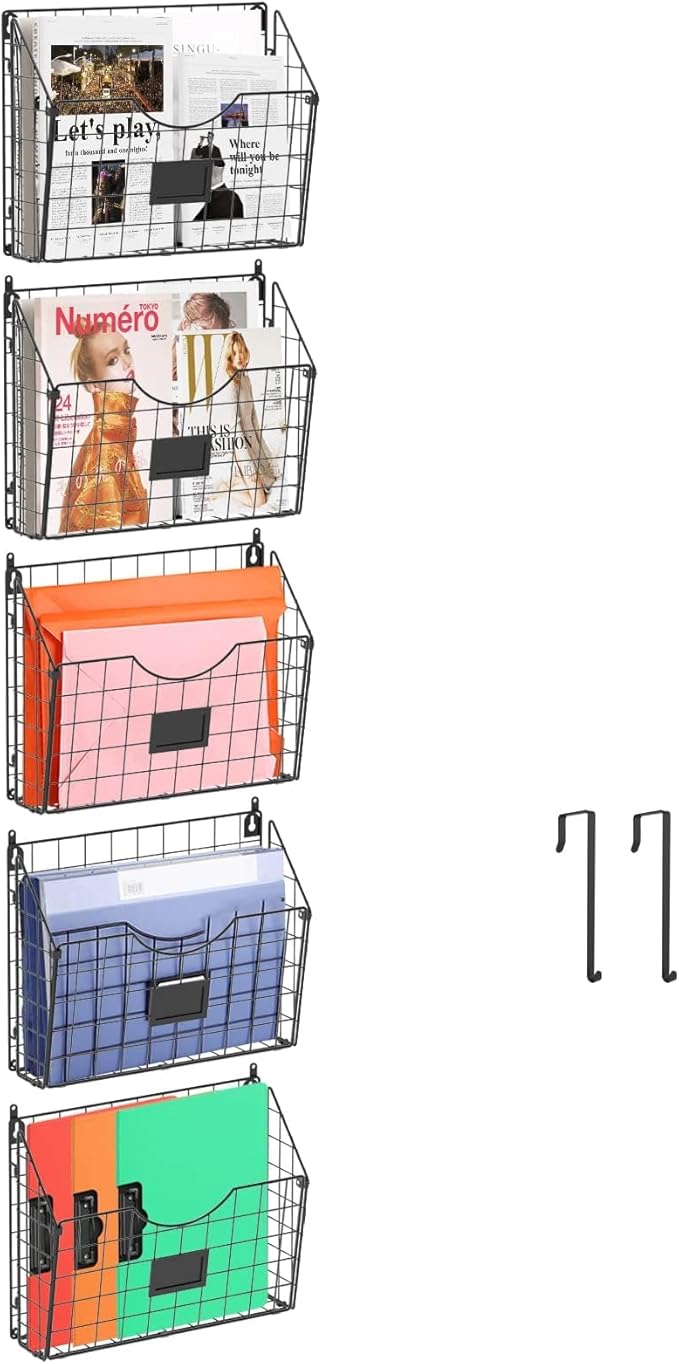 - Wall hanging files organizer: 5-tier stackable&detachable hanging metal wall file . For sorting files, documents, magazines, literature, catalogs, mail, letters, charts, brochures and notebooks.Also the tag slot help you quickly what in the file rack