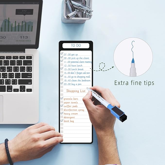 - Fine-point markers included – We also provide 6 extra-fine point markers with different colors, so you may use your own color coding. These magnetic markers stay conveniently attached to your fridge.
