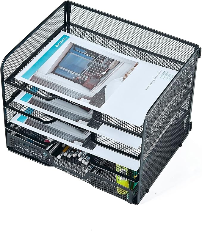 SETTFRFE 4 Tier Mesh Paper Letter Tray,Desk File Organizer with A Sliding Drawer,Office Supplies Desk Organizer for Home Office,Black.