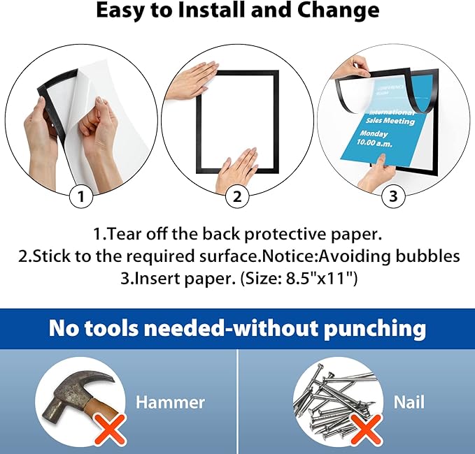 - ✔【Self-Adhesive Back 】The back of magnetic display frame is made of 3M adhesive material, the super adhesive force makes the frame not easy to fall off. So easy to install, no extra tools required. Just peel off the adhesive paper, stick it on any smooth surface, and insert the paper. (Suggest: Use on smooth and neat surfaces, the bond will last longer!)