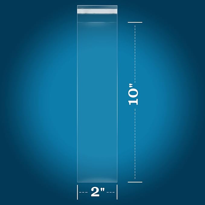 - [SPECIFICATION]: 200 PCS - 2" x 10"(Excludes Glue Flap) Resealable Cellophane Style Bags - Self Sealing. 1.4 Mil Thickness.