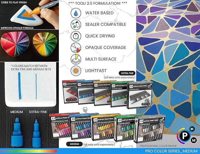 TOOLI-ART 22 Acrylic Paint Markers Paint Pens Pro Color Series Set 3mm Medium Tip for Rock Painting, Glass, Mugs, Wood, Metal, Glass Paint, Canvas, DIY. Non Toxic, Waterbased, Quick Drying (BLUES)