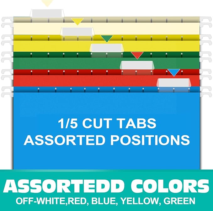 - HANGING FOLDERS SET: Contains 30 extra capacity folders with 30 cardboard supports, 30 printable label sheets, 30 clear plastic tabs and comes in 5 assorted primary colors (off-white, red, blue, yellow, and green) to make color-coded filing categories.