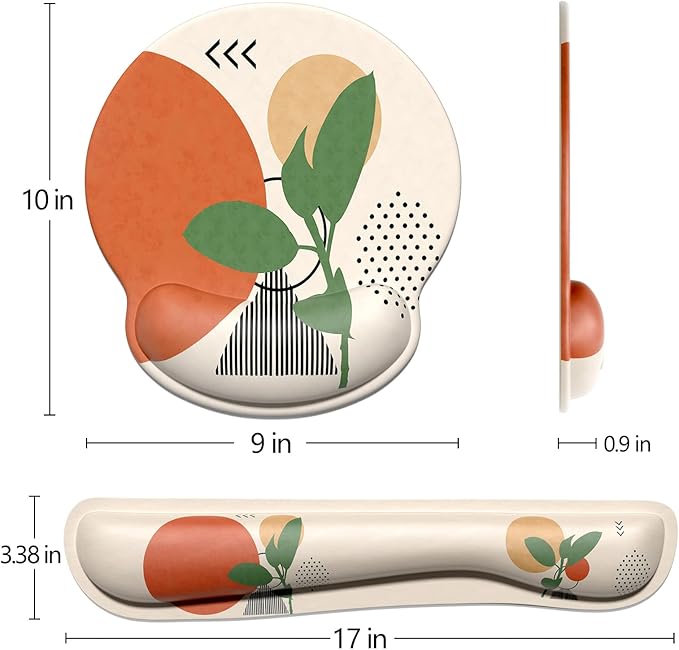 - Optimal Size: 17*3.38*0.9 inch keyboard wrist pad offers more support to your wrist, 10*9*0.9 inch large mouse pad allows your mouse to move freely. Perfect size fits most keyboards, laptops and mice