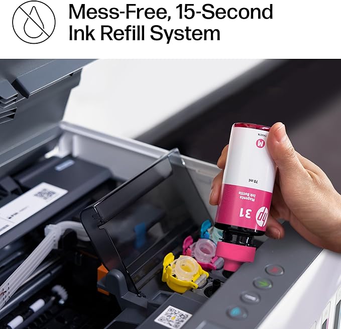 - MESS-FREE REFILL – Replenish ink with HP's easy-access, mess-free refill system. Simply plug the ink bottles into this cartridge-free ink tank and let them drain—no squeezing, no spilling