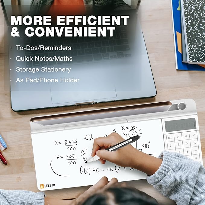 - ✅MULTIFUNCTIONAL: Storage, calculate, write, hold iPad, keyboard stand,our desktop white board is an all in one multipurpose desk board buddy.Equipped with 1 black dry erase marker,smooth writing,also with the eraser cap for easily wipe.