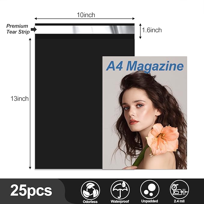 - 【Save Your Shipping】Inner Size (Available): 10x13 inches; Thickness: 2.4mil; Quantity: 25 Pieces. Lightweight and easy to ship, these mailers poly bags are a great alternative to bulky and expensive shipping boxes and can save you a lot on shipping. If you have a lot of orders to mail each day, these poly mailing bags are perfect for you!