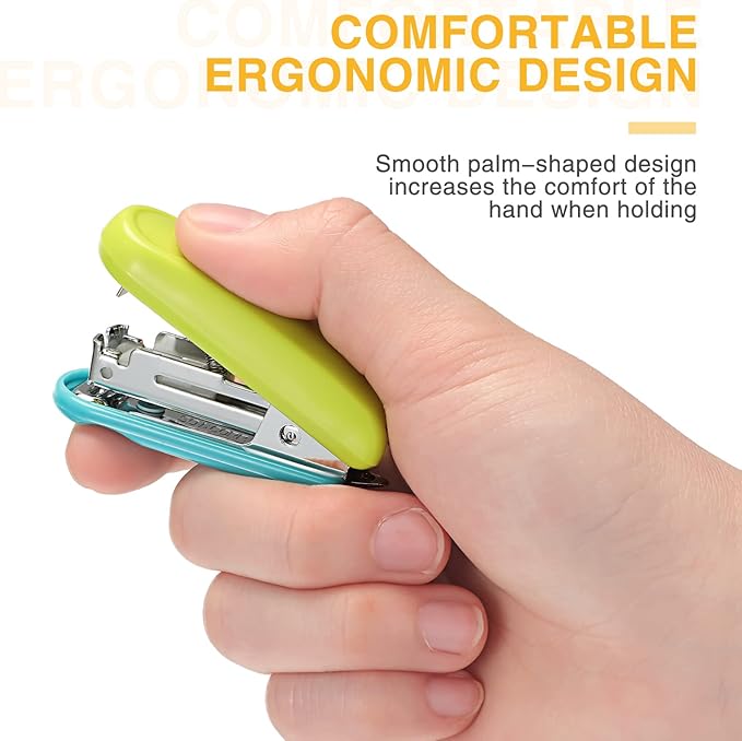 - Palm Shaped Design: the mini stapler with staples features smooth palm shaped the appearance design, the smooth curve help increase the comfort of gripping, and the pressing place adopts groove design, so you can easily transmit the force of the thumb pressing to the staple during binding, very easy to use and bind