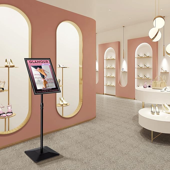 - ✔【ADJUSTABLE HEIGHT&ANGLE】11" x 17"Poster Sign Stand height is adjustable from 30" to 53". The aluminum frame can be displayed horizontally and vertically, and can be rotated 360° flexibly. So that customers can easily read the info from different angles.