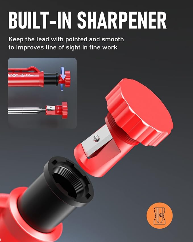 - Carpenter Pencils with Sharpener: The sharpener is screwed into the top of the work pencil, which won't get lost either. Built-in pencil sharpener that keep the lead with pointed and smooth to Improves line of sight in fine work